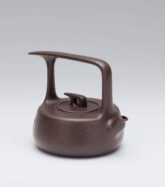 因壺體雙側雕刻篆書籍“二三點露不可雨,七八個星猶在天”,該壺得名“雨露天星”。其完全造型莊重周正而具備時期氣味,表面明亮,弛勁有力,如共聳立風中,氣質宏偉;共時又于拙樸中睹纖巧,整把壺呈流線型,遠瞅此壺,好像飛鳥于天。這把壺將直線與曲線接織使用,轉變處明快流麗,提梁及蓋的造型安排超過,產生方中有方、方中戴圓、圓中含方的構圖;并且壺的光彩紫中泛紅,樸雅高凈。因此,不管將它置于何種情況中品茗參瞅,都能凸顯無限神色和底細。
